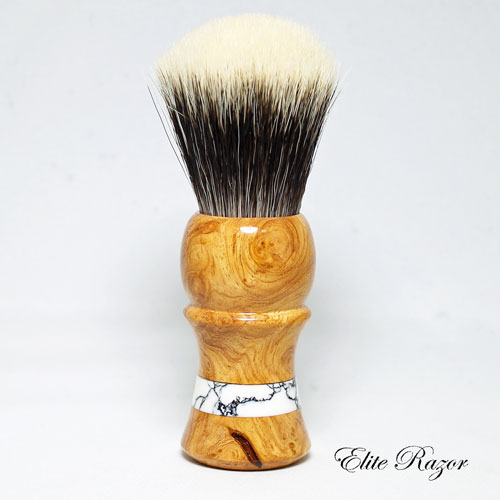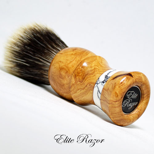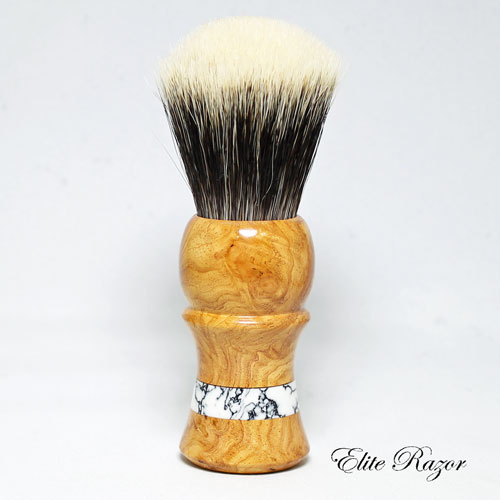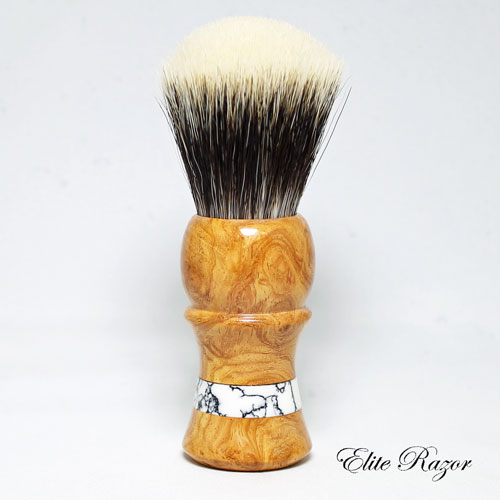 This brush features a handcrafted handle by Robert Quinn from Afzelia Burl wood that grows in tropical Africa and Asia. The heartwood is reddish brown after exposure to the elements and the sapwood is pale straw to whitish. Afzelia Burl is a very rare wood and is only available in small dimensions. Afzelia is used mainly for doors, windows, floors and staircases. This handle features an accent ring of Tourmaline Laced Quartz.
