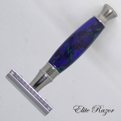 This handle is made from Azurite, which is an intense deep blue color and often occurs with Malachite. Different sources claim the name is derived from the Persian word lazhward or from the Arabic word azul, both of which mean blue. Azurite is found in Australia, Chile, France, Mexico, Morocco, Nambia, the southwestern USA, and Zaire. For thousands of years this stone has been used in jewelry and ornamental objects. During the Middle Ages and Renaissance, it was ground into pigment for use in paint and eye shadow. It is not known widely as a birthstone, but several references indicate it may have been used as a birthstone for the sign of Taurus. Azurite was sacred to the Egyptians who believed it was an aid to spiritual communication. Many believe that this stone helps to reduce anger and to increase psychic awareness. It is also thought to reduce abnormal cell growth, promote wisdom, and is used as an aid to relieve the pain of rheumatism.