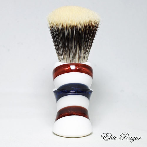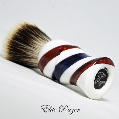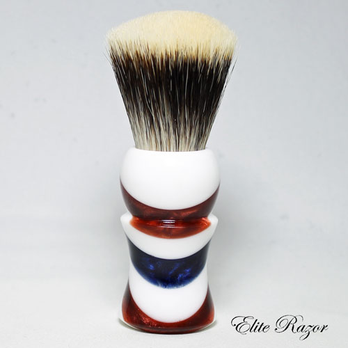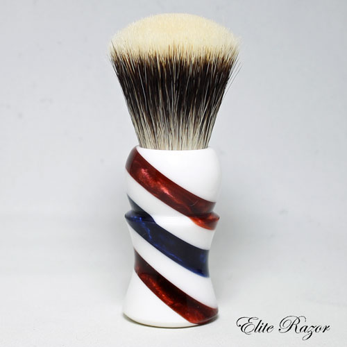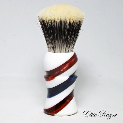 This brush features a handcrafted handle by Robert Quinn from separate pours of resin to simulate the traditional Barber’s Pole. The modern Barber’s Pole originated in the day when blood-letting was one of the principal duties of the barbering trade. The two spiral ribbons painted around the pole represented two long bandages, one twisted around the arm before bleeding (to make the vein stand out), and the other used to bind it afterwards. The first European poles contained only red and white stripes and some historians credit the blue stripe on the American poles as having been transported from blue and white bands on English poles of the 1700’s. Other authorities say that American barbers added the blue stripe to their red and white poles as a patriotic gesture.