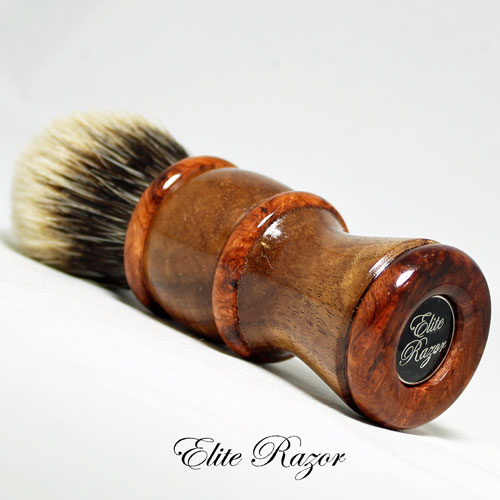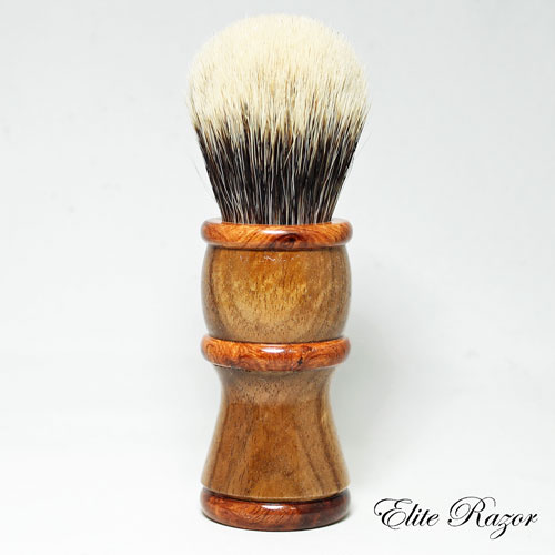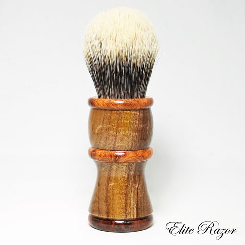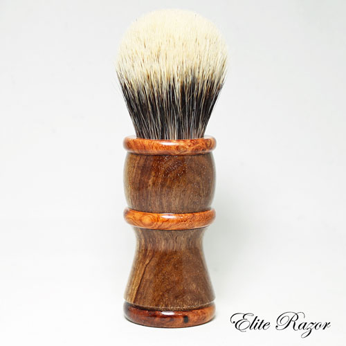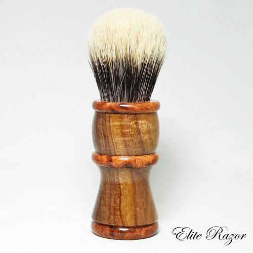 This brush features a handcrafted handle by Robert Quinn from curly Koa which only grows in Hawaii. Koa is the largest tree species in Hawaii – the species exists naturally nowhere else in the world. It is the fastest growing of Hawaii’s valuable hardwoods. It can grow as much as an inch in diameter per year, reaching 100 feet in height, attaining a trunk diameter of 5 feet or more. It is recognized worldwide for its remarkable variety of grain figure which ranges from plain, to curly, to deep fiddleback. It was historically the material of choice for carved ocean-going canoes. Koa wood is the most prized cabinet and furniture wood in Hawaii. Highly figured Koa is sought after for use in fine furniture, musical instruments, crafts, gunstocks, and knife handles. This handle features accents of Amboyna Burl.
