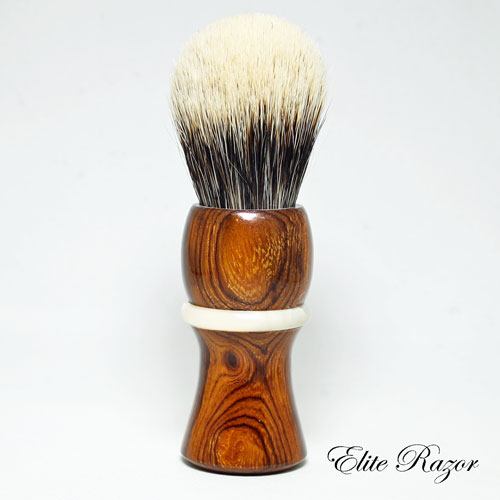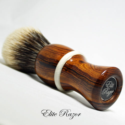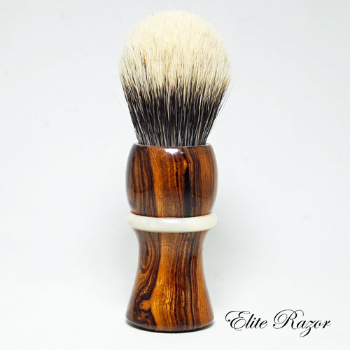 This brush features a handcrafted handle by Robert Quinn from Desert Ironwood which only grows in the washes and valleys of the Sonoran Desert below 2,500 foot elevation. Desert Ironwood is very hard and dense. It actually sinks in water. Tradition has it that carvings made from the Desert Ironwood bring good fortune and long life. Desert Ironwood reaches maturity at 2000 years, more or less. It was originally used by the Seri Native Americans of Mexico for tool handles. Today the Seri Indians make carvings of desert plants and animals from the ironwood. Desert Ironwood was the original choice of material for the grips of the Colt .45 handgun. This handle features an accent ring of Mother of Pearl.