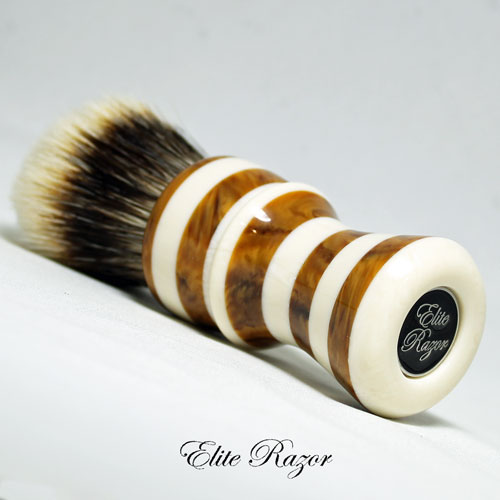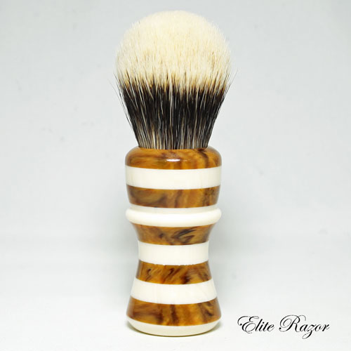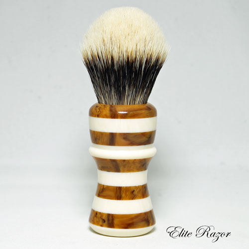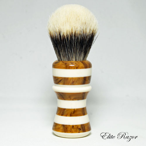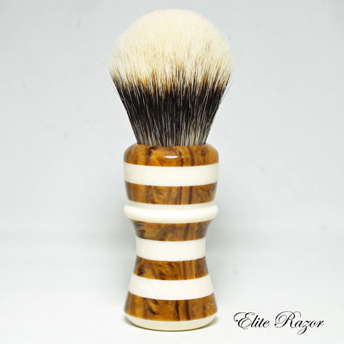 This brush features a handcrafted handle by Robert Quinn from made from 10 alternating segments of Ivory and Wood Grain Acrylic. The use of resins has dramatically expanded the range of colors and stylings that are available. The Neo-Resinate is poured into molds with either contrasting or complimentary colors and cured in a pressure pot to create the turning material.