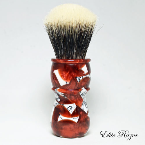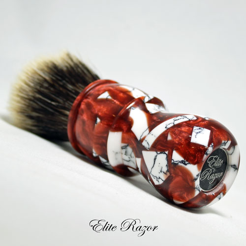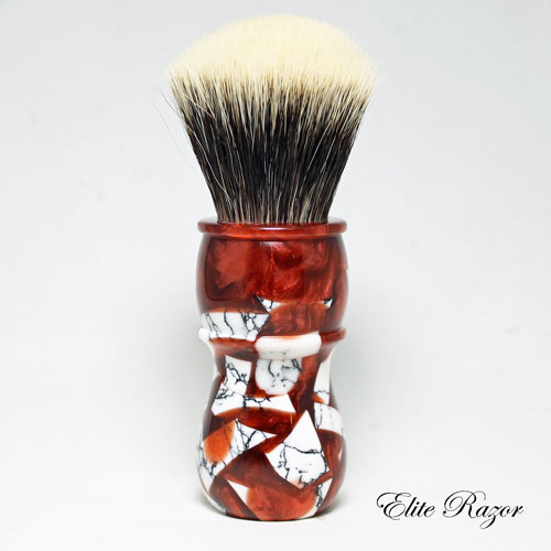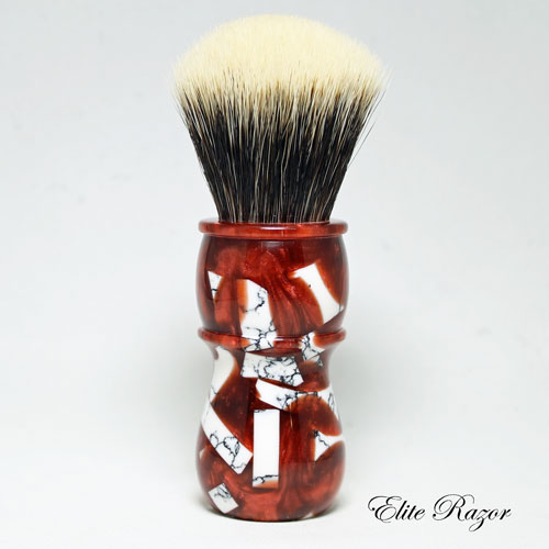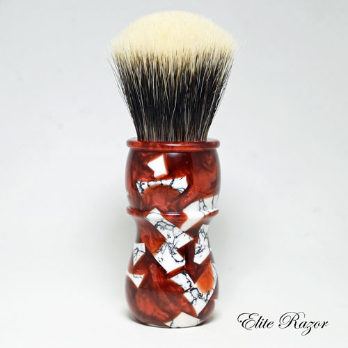 This brush features a handcrafted handle by Robert Quinn from a selection of small Tourmaline Laced Quartz TruStone pieces mixed into a red resin. Tourmaline Laced Quartz, which may be found in mountainous areas throughout the United States, but predominately in the northern Sierra Nevada area. Quartz is the second most abundant mineral in the Earth’s crust, after Feldspar. Quartz can appear in many colors from bright purple to milky white to absolutely clear. Roman naturalist Pliny the Elder, believed Quartz to be water ice, permanently frozen after great lengths of time. (The word “crystal” comes from the Greek word for purity.) He supported this idea by saying that Quartz is found near glaciers in the Alps, but not on volcanic mountains.